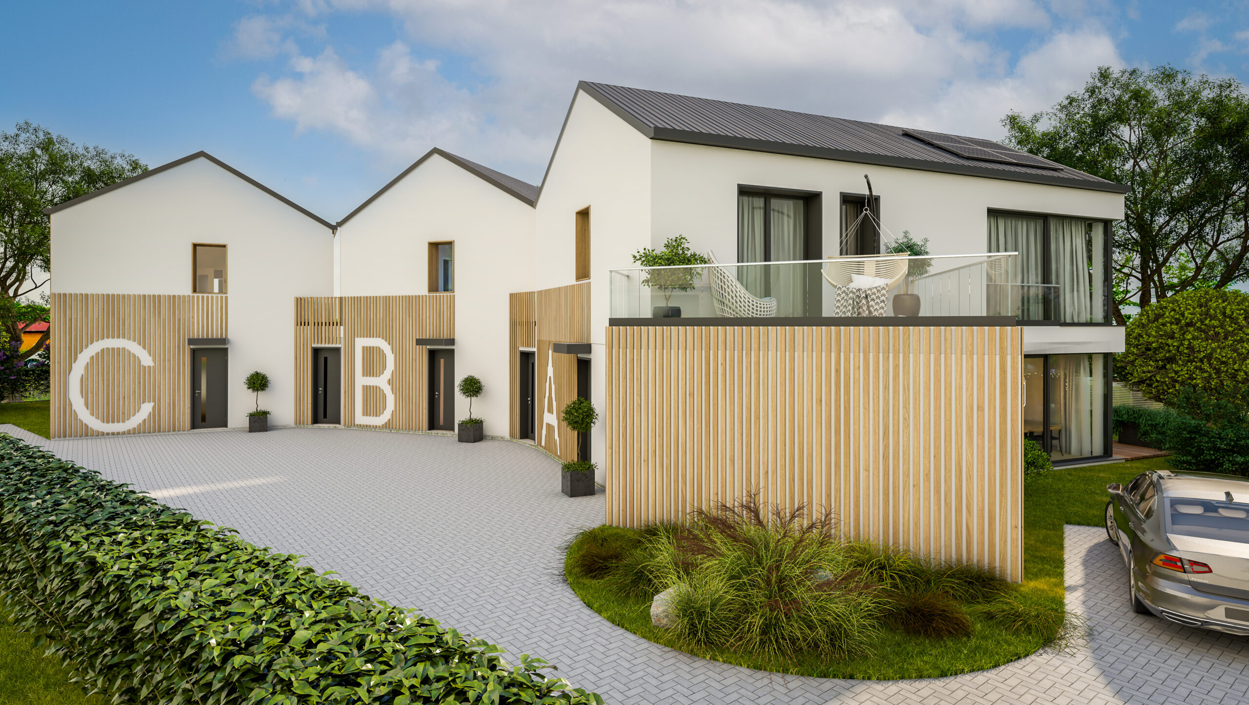 DESIGNOVÁ MODERNÍ NOVOSTAVBA TROJLÍSTEK NABÍZÍ TŘI PROSTORNÉ BYTY 5+KK(145m²) SE ZAHRADOU, VYSOKÝMI STROPY, ŠATNOU A VELKÝM ÚLOŽNÝM PROSTOREM. NACHÁZÍ SE V KLIDNÉ OBCI POSTŘIŽÍN OBKLOPENÉ PŘÍRODOU, JEN 10 MINUT OD PRAHY.